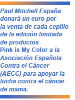 Paul Mitchell España donará un euro por la venta de cada cepillo de la edición limitada de productos Pink is My Color a la Asociación Española Contra el Cáncer (AECC) para apoyar la lucha contra el cáncer de mama.