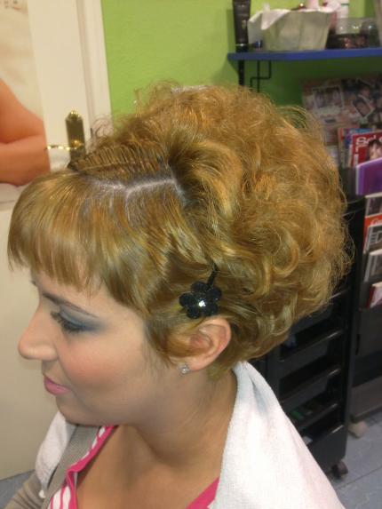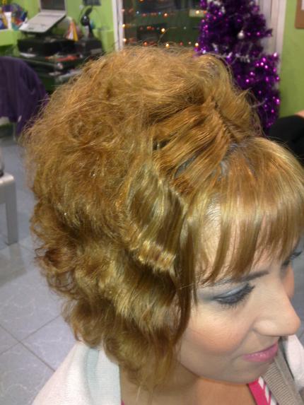me apetece compartir este peinado de nochevieja con vosotr@s ya que el pelo es tamaño mas bien corto y asimetrico, por cierto esta chica paso hace 15 dias de negro potenciado azul al rubio que se ve (de hay la raiz ya inminente) el peinado le encanto
