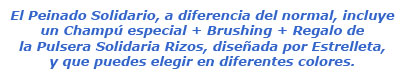 Esta es la primera vez que una firma de moda realiza una acción solidaria de este tipo, y Rizos te invita a que colabores con su causa benéfica. Para ello, sólo tienes que solicitar en tu peluquería Rizos o Azul de Rizos tu Peinado Solidario, que a diferencia del normal, incluye un Champú especial + Brushing + Regalo de la Pulsera Solidaria Rizos, diseñada por Estrelleta, y que puedes elegir en diferentes colores.