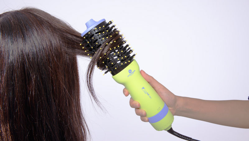 El cabezal está equipado con cerdas de nylon de alta densidad, diseñadas para desenredar el cabello, aportar volumen y brillo y ayudar a estimular el cuero cabelludo, respetando la fibra capilar y favoreciendo un resultado natural, sin encrespamiento.