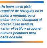 El pixie cut, cuyo nombre proviene de la denominación inglesa para las hadas y duendes más traviesos, se caracteriza por una longitud muy corta del cabello en los costados y la parte trasera de la cabeza, permitiendo algo más de longitud para la parte superior y el flequillo. De esta manera se enmarca la cara de manera natural y se resalta la belleza propia del rostro.