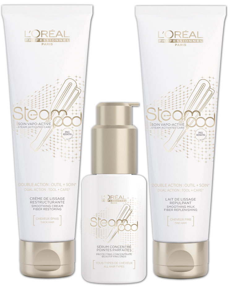 Steampod 2.0 lleva asociados 3 productos: crema, leche y sérum, enriquecidos con Pro-Keratina que dotan al cabello de un brillo intenso, tacto sedoso y puntas selladas. Aplicamos los productos sobre el cabello y luego sellamos las puntas con la plancha. Por un lado, la crema para cabello natural o algo sensibilizado, con el fin de reparar la fibra capilar, mientras que podemos aplicar la leche especial para cabellos finos, y el sérum para puntas y otras áreas sensibilizadas.