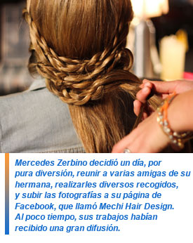 Lo que comenzó como un simple hobby hace dos años, se ha convertido ahora en un popular y lucrativo negocio para Mercedes Zerbino. Esta estudiante de diseño gráfico de 23 años decidió un día, por pura diversión, reunir a varias amigas de su hermana, realizarles diversos recogidos, y subir las fotografías a su página de Facebook, que llamó Mechi Hair Design. Al poco tiempo, sus trabajos habían recibido una gran difusión, muchas clientas pedían sus servicios de cara a ceremonias nupciales y otras celebraciones, y ella se encontró con un negocio que además le resulta muy divertido.