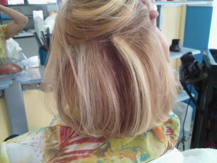 esperad ,mi prima es la del recogido, esta es una clienta que tenia una raiz muy grande altura 5 y medios y puntas muy de mechas gastada.abajo el color final