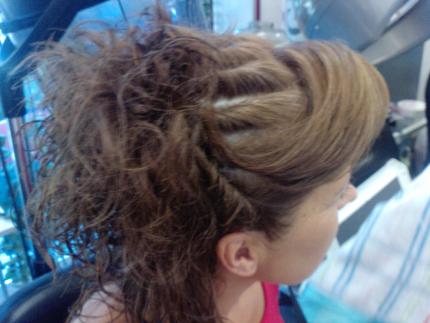 El semi muy guapo!, que vá recogido con una goma, o con horquillas?. Si se lo hubieras dejado todo recogido le hubiera quedado más chulo, me refiero al mechón que le has dejado suelto.