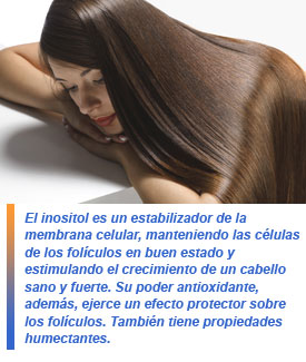 El inositol es un estabilizador de la membrana celular, manteniendo las células de los folículos en buen estado y estimulando el crecimiento de un cabello sano y fuerte. Su poder antioxidante, además, ejerce un efecto protector sobre los folículos. También tiene propiedades humectantes.