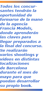 Todos los concursantes tendrán la oportunidad de formarse de la mano de la agencia Francina Models, donde aprenderán las claves para llegar preparados a la final del concurso. Se realizarán varios shootings y vídeos en distintas localizaciones de Barcelona durante el mes de mayo para que puedan desarrollar su propio book.
