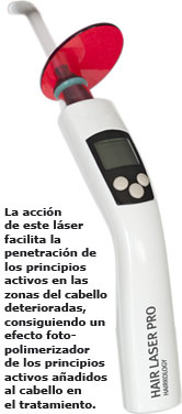 La acción de este láser consigue un efecto foto-catalizador (facilita la penetración de los principios activos en las zonas del cabello deterioradas) y foto-polimerizador de los principios activos añadidos al cabello en el tratamiento.