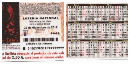 Yo les hago un calendario de bolsillo y detras una perticipacion de loteria 0,50, ademas este año soñe con ese numero...jejejej. Por si acaso lo busque y los hice con el numero soñado.