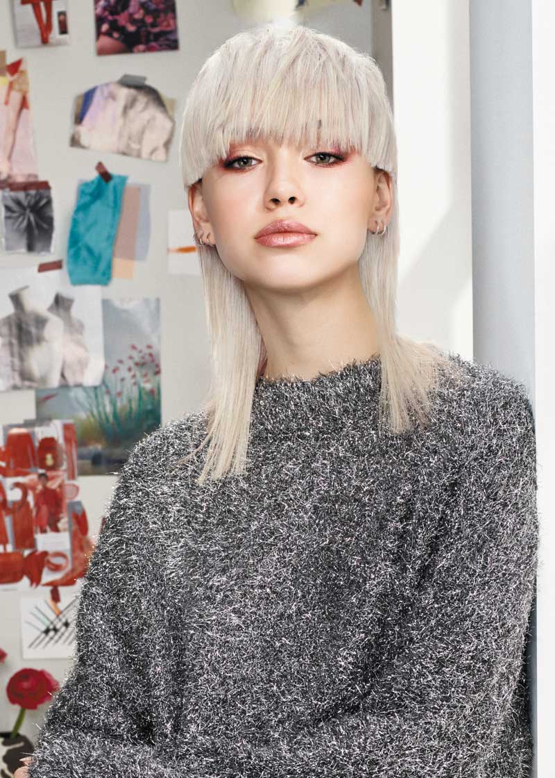 El corte mullet plantea una ruptura entre líneas horizontales y verticales al estilo glam. El tono satinado que parte de una base rubia, logra un acabado deslumbrante.