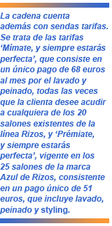 Para ello, la cadena referente en salones de peluquería y estética de alta gama, que está a la vanguardia de las últimas técnicas y tratamientos, cuenta además con sendas tarifas especialmente pensadas para favorecer a sus clientas más fieles y a aquellas otras que no acuden más a su peluquería por motivos económicos. Se trata de las tarifas Mímate, y siempre estarás perfecta, que consiste en un único pago de 68 euros al mes por el lavado y peinado, todas las veces que la clienta desee acudir a cualquiera de los 20 salones existentes de la línea Rizos, y Prémiate, y siempre estarás perfecta, vigente en los 25 salones de la marca Azul de Rizos, consistente en un pago único de 51 euros, que incluye lavado, peinado y styling.