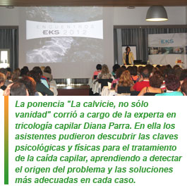 La temática central del Encuentro EKS 2012 fue la caída del cabello. El domingo 24 la ponencia "La calvicie, no sólo vanidad" corrió a cargo de la experta en tricología capilar Diana Parra. En ella los asistentes pudieron descubrir las claves psicológicas y físicas para el tratamiento de la caída capilar, aprendiendo a detectar el origen del problema y las soluciones más adecuadas en cada caso.