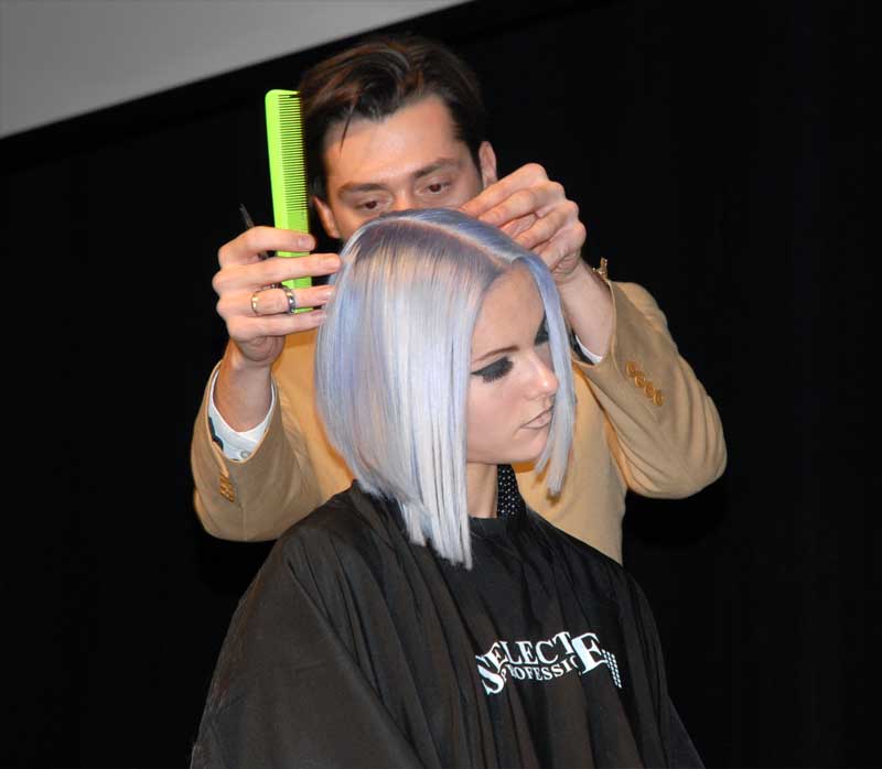 Carles Dalmau ofreció un corte en melena corta, con líneas muy rectas que incorporaban toques totalmente desconectados y dos fuertes desconexiones. Para sus coloraciones se decantó por tonos naturales de Colorevo y toques fantasía rojo-naranja-morada.