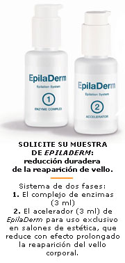 El tratamiento de enzimas EpilaDerm es un high tech gel de dos fases que consiste en la combinación del complejo de enzimas (fase 1) con un acelerador (fase 2), que se aplica inmediatamente después de la depilación con cera o con azúcar para reducir, con efecto prolongado, la reaparición del vello corporal.