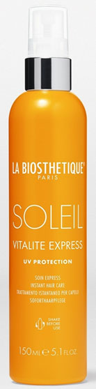 Principios activos: protección UVA/UVB de banda ancha, extracto de girasol, potenciadores de brillo y perfume. - Soleil Vitalite Express. Espray bifásico, resistente al agua, con sistema activo combinado. Cuidado intensivo de acción instantánea y protección UV. Proporciona brillo y suavidad.