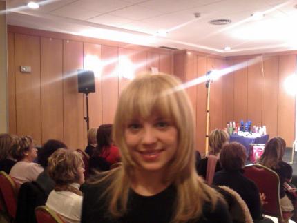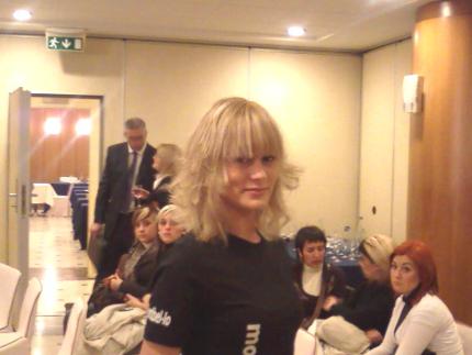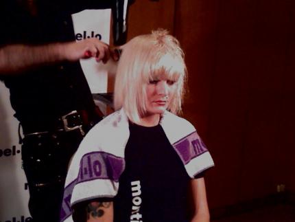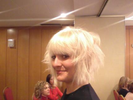 La chica nº2 dió lastimita pues tenía una base natural grisácea y preciosa, altura 9, con alguna mecha aleatoria decolorada en medios y puntas. A esta chica le pusieron el 1035, es decir el superaclarante cobre dorado con oxigenada de 30 volúmenes (si no recuerdo mal, Mario lo lleva apuntado todo). Es un color del que siempre huímos pues casi todas las bases tienden a doradas o a naranjas cuando intentamos aclararlas. Sin embargo a esta chica le quedó muy bonito, pues ella ya era rubia de sí.