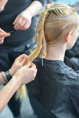 Por último, Tex Saverio presentó una colección de alta costura bautizada como Exoesqueleto. El diseñador, que ha vestido a Lady Gaga y ha diseñado el vestuario de Jennifer Lawrence en la película Los Juegos del Hambre, ha creado un universo fantástico combinando las últimas tecnologías. Para Maria Kovacs, European Session Director de Tigi, era importante que el pelo fuera reflejo de la fuerza interior de la mujer, así que los estilismo se basaban en el pelo pegado a la cabeza y la raya en medio, como si se hubieran puesto un casco.