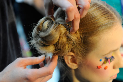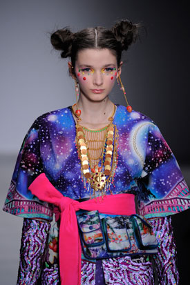 Para el desfile de Manish Arora, la inspiración fue el estilo de vida gipsy, los coloridos dulces como cupcakes o donuts, y las jovencitas futuristas de siluetas estridentes o jóvenes madres con portabebés. Los estilistas optaron por dar un leve toque bohemio con la aplicación de mechas, y en los peinados reinaban las trenzas muy apretadas.