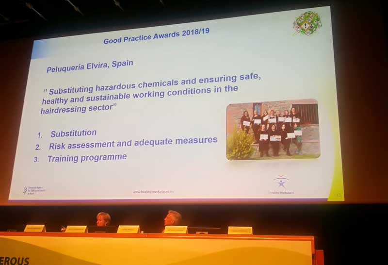 Esther Martí es la representante a nivel europeo de la nueva Peluquería Saludable y Sostenible que ha sido Premiada por la organización EUOSHA, por las buenas prácticas en la sustitución de productos químicos peligrosos, y gracias a su proyecto Peluquería Elvira Saludable y Sostenible, el cual forman una Red Internacional de Peluquerías formadas por ella misma desde 2015 y que trabajan de manera saludable por sus clientes, sus empleados y el planeta. Contribuyendo así a poder conseguir los ODS 2030.