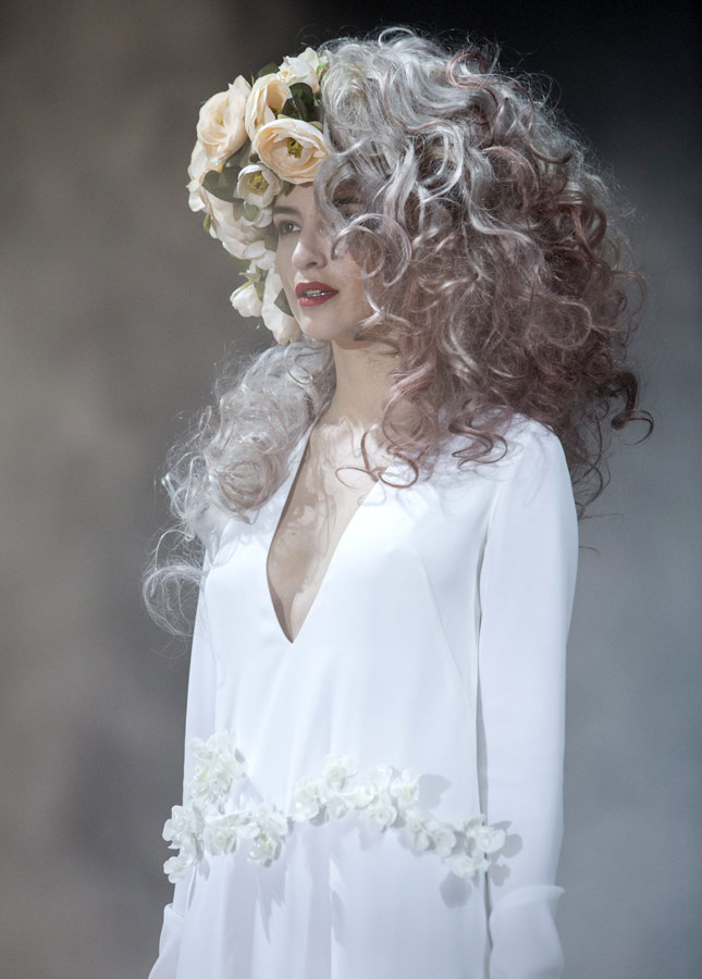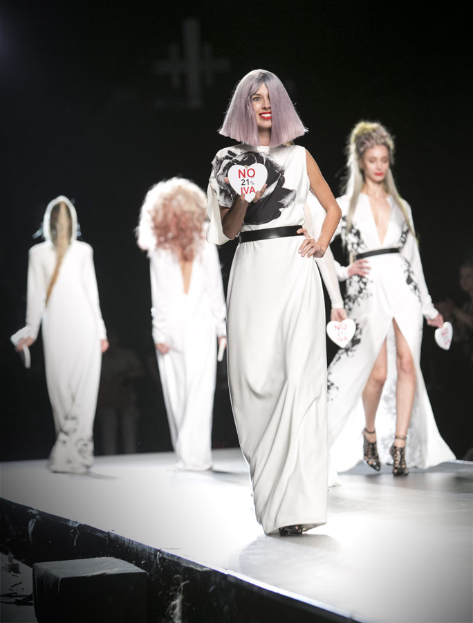 Raffel Pages presentó una colección poética, con tonos pastel, trenzas, grandes volúmenes y flores. Los moños trabajados fueron los protagonistas. Cabellos con líneas simplificadas y limpias con un resultado muy sofisticado. Como no podía dejar de ser, terminó su performance con una reivindicación: "No al 21% del IVA", aclamado por los asistentes.