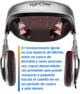 El revolucionario Igrow es una especie de híbrido, entre un casco de bicicleta y unos auriculares, cuyos desarrolladores prometen que puede restaurar a pequeña escala, esto es, en los casos de incipiente alopecia, el cabello en un período de cuatro a seis meses.