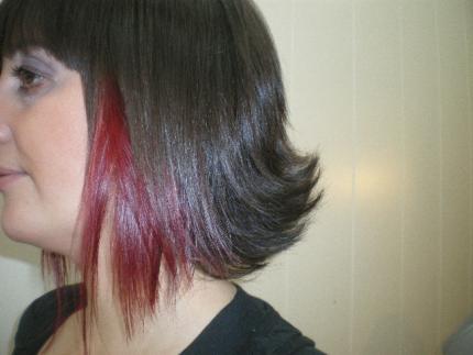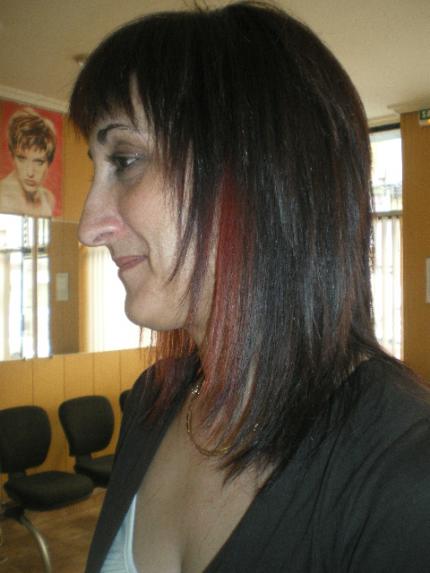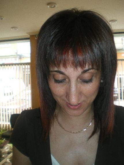 ahora me ha dado por hacer pequeños toques de color,sueves que se noten de manera sutil,los hago siempre en el interior y asi no se aprecia raiz y lo pueden llevar mas tiempo sin retoque,esta chica lleva lleva un color marron no muy oscuro y le he puesto magicontras cobrizo puro,creo que queda bonito