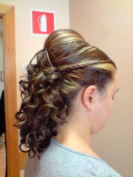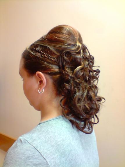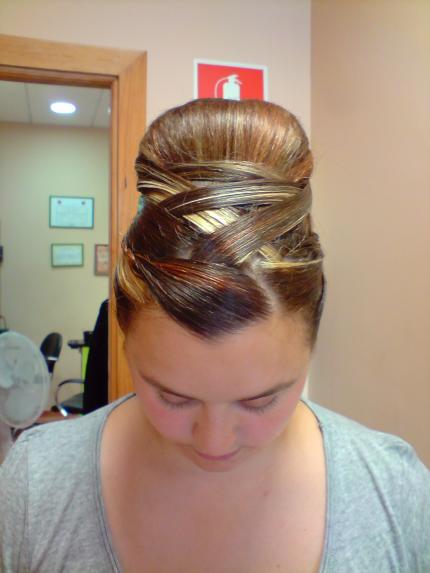 Es curioso, el simple detalle de las trenzas laterales resaltan el recojido dando una imagen mas vistosa y aportando originalidad. Personalmete me quedo con el cruzado de arriba, para mi es la zona mas vistosa por los cruzados que te quedaron genial. Con este recojido consigues que la chica no pase desapercivida; es un gran trabajo. Un saludo.