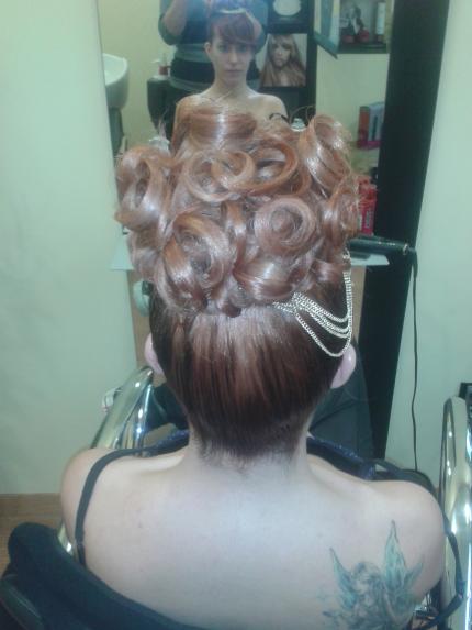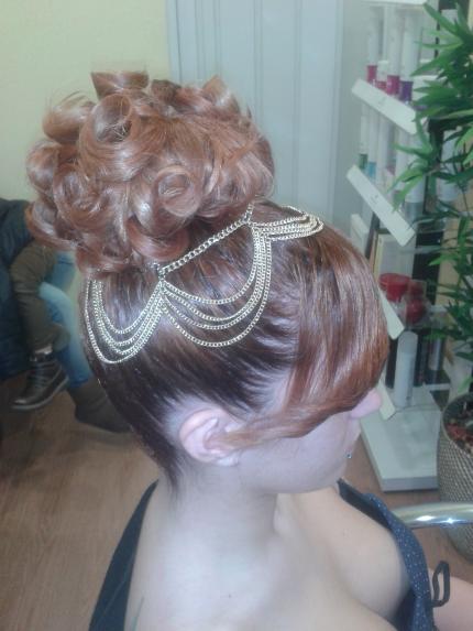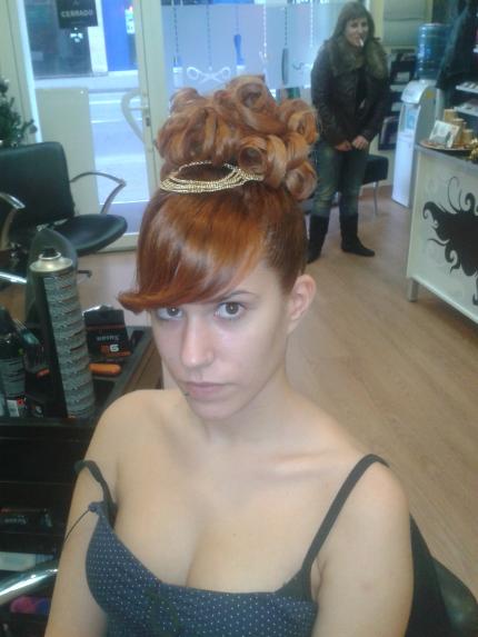 Bien hecho pero yo el flequillo lo hubiera hecho para atrás,seguramente ella lo quería así.El adorno no me gusta mucho,pero repito que el recogido bien realizado.Saludos