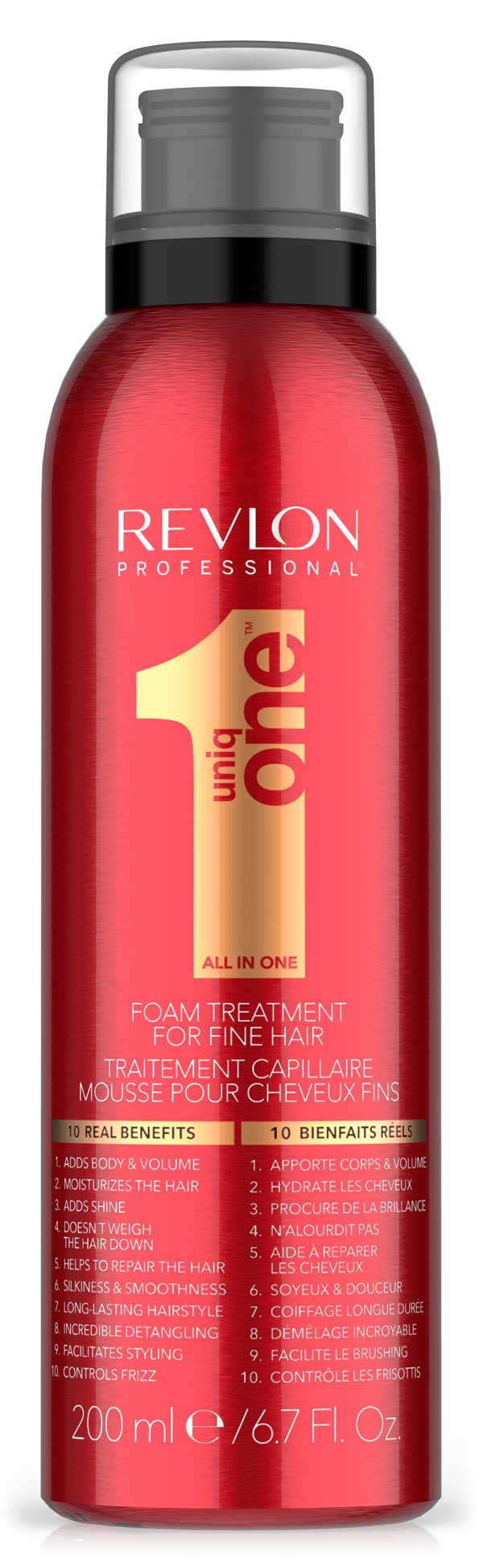 UniqOne Foam Treatment es una mascarilla formulada con textura de espuma ligera específica para mujeres de cabello fino. Esta mascarilla sin aclarado aporta todos los beneficios de un producto de este tipo, pero sin agregar peso innecesario. Tras su uso, el cabello se muestra saludable y gana grosor y cuerpo.