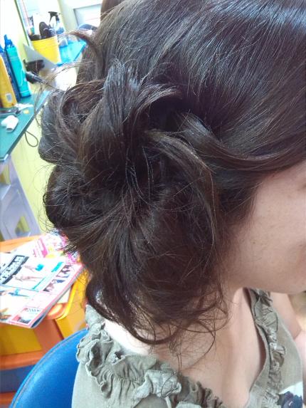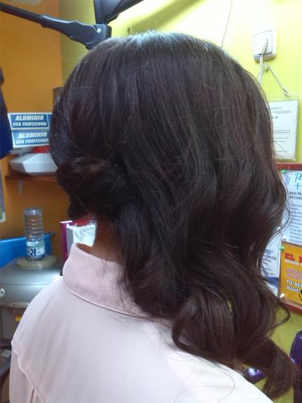 la madre de la novia.......le hice este peinado porque lleva..una diadema con un tocado precioso enorme simulando una pamela......quise conseguir el efecto de rizos suaves sueltos cuando lleve el tocado y si se cansa y quita la diadema le queda un recogido mono....no malos pelos jejejejjejeje