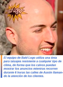 El equipo de Bald Logo utiliza una tinta para tatuajes resistente a cualquier tipo de clima, de forma que los calvos puedan mostrar los anuncios mientras recorren durante 6 horas las calles de Austin llamando la atención de los clientes.