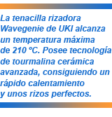 Alisa, marca y permite todo tipo de peinados, obteniendo rizos perfectos. Tecnología de tourmalina cerámica avanzada y rápido calentamiento. Con 3 metros de cable giratorio 360º. Medidas: 22 mm/10 mm. Wavegenie es un producto patentado por UKI Professional.
