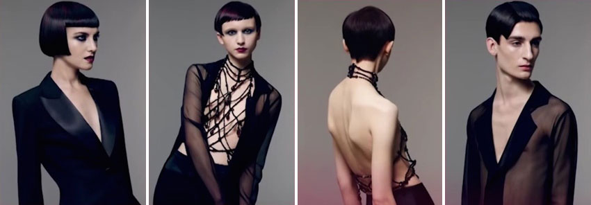 Los elementos clave de las colecciones están marcados por el contraste entre la emancipación de la mujer, silueta longuilínea, el look bob de los años 30 y el look de los año 60, la figura masculina femineizada.