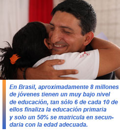 Brasil se enfrenta a enormes retos para asegurar que cada niño y cada joven cuente con las habilidades y oportunidades necesarias para labrar su futuro. Aproximadamente 8 millones de jóvenes tienen un muy bajo nivel de educación, tan sólo 6 de cada 10 de ellos finaliza la educación primaria y solo un 50% se matricula en secundaria con la edad adecuada.
