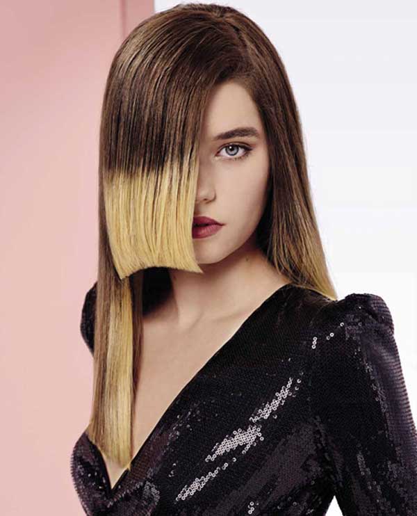 Un conjunto integrado por el corte mullet, corto por delante y largo por detrás, desconectando todo el contorno, que permite suavizar el contraste de las bandas y hacer una progresión del color que armoniza el rostro.
