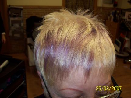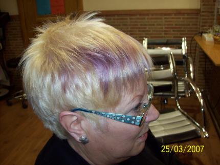 En los mechones le puse un violeta intenso a una altura 6 con revelador a 6v con el doble de cantidad , controlando el color,unos segundos.