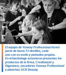 También en el backstage estuvieron presentes los productos de la firma, Creationyst y Vigorance, secadores Yunsey Professional y planchas GCK Beauty, con los que se trabajaron todo tipo de cabellos y se crearon peinados en tiempo record, desde las ondas más voluminosas hasta los lisos más suaves.